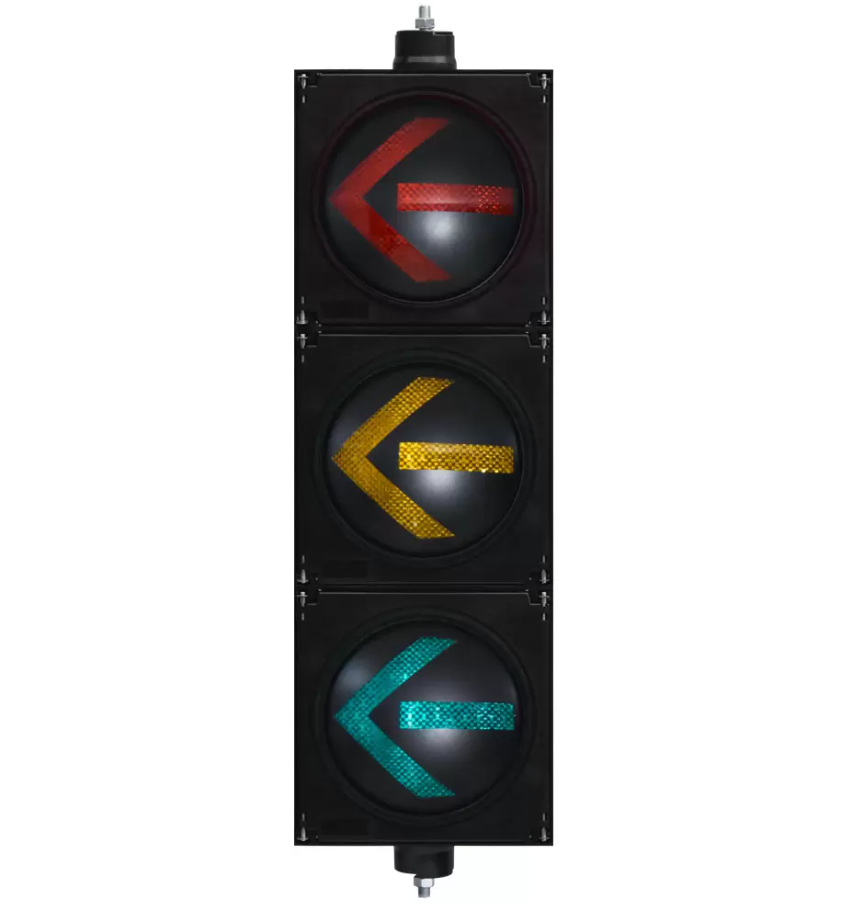 The High Flux Red/Yellow/Green Arrow Traffic Light is a three-unit assembly. The lamp core consists of a large-sized light source, three-layer optical lenses, a power supply unit, a lamp bowl, and an external heat dissipation module, among other structural components. The optical mechanism operates through three-layer optical processing to enhance the luminous efficiency, diffuse, and refocus the point light emitted from the light source, thereby generating a uniform surface light output. It is applicable to a wide range of traffic signal control intersections.